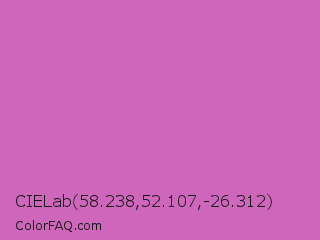 CIELab 58.238,52.107,-26.312 Color is a normal magenta color and the nearest color is Sky Magenta #cf71af. Hex code #ce66bb and RGB value is rgb(206,102,187). In RGB color space, this color is composed of 81% red, 40% green, 73% blue, In CMYK color space, this color is composed of 0% cyan, 50% magenta, 9% yellow , 19% black , In HSL color space, this color has a hue angle of 311° , 51% saturation and 60% lightness.