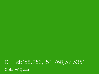 CIELab 58.253,-54.768,57.536 Color is a normal green color and the nearest color is Slimy Green #299617. Hex code #33a10f and RGB value is rgb(51,161,15). In RGB color space, this color is composed of 20% red, 63% green, 6% blue, In CMYK color space, this color is composed of 68% cyan, 0% magenta, 91% yellow , 37% black , In HSL color space, this color has a hue angle of 105° , 83% saturation and 35% lightness.