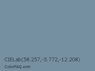CIELab 58.257,-5.772,-12.208 Color is a normal blue color and the nearest color is Shadow Blue #778ba5. Hex code #7490a1 and RGB value is rgb(116,144,161). In RGB color space, this color is composed of 45% red, 56% green, 63% blue, In CMYK color space, this color is composed of 28% cyan, 11% magenta, 0% yellow , 37% black , In HSL color space, this color has a hue angle of 203° , 19% saturation and 54% lightness.