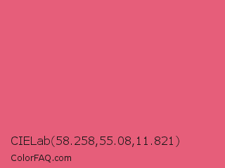 CIELab 58.258,55.08,11.821 Color is a light red color and the nearest color is Dark Pink #e75480. Hex code #e65e7a and RGB value is rgb(230,94,122). In RGB color space, this color is composed of 90% red, 37% green, 48% blue, In CMYK color space, this color is composed of 0% cyan, 59% magenta, 47% yellow , 10% black , In HSL color space, this color has a hue angle of 348° , 73% saturation and 64% lightness.