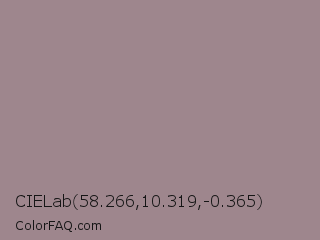CIELab 58.266,10.319,-0.365 Color is a normal rose color and the nearest color is Venus #928590. Hex code #9e868d and RGB value is rgb(158,134,141). In RGB color space, this color is composed of 62% red, 53% green, 55% blue, In CMYK color space, this color is composed of 0% cyan, 15% magenta, 11% yellow , 38% black , In HSL color space, this color has a hue angle of 343° , 11% saturation and 57% lightness.