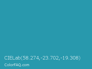 CIELab 58.274,-23.702,-19.308 Color is a normal cyan color and the nearest color is Eastern Blue #1e9ab0. Hex code #2899ad and RGB value is rgb(40,153,173). In RGB color space, this color is composed of 16% red, 60% green, 68% blue, In CMYK color space, this color is composed of 77% cyan, 12% magenta, 0% yellow , 32% black , In HSL color space, this color has a hue angle of 189° , 62% saturation and 42% lightness.