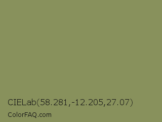 CIELab 58.281,-12.205,27.07 Color is a normal yellow color and the nearest color is Moss Green #8a9a5b. Hex code #88915c and RGB value is rgb(136,145,92). In RGB color space, this color is composed of 53% red, 57% green, 36% blue, In CMYK color space, this color is composed of 6% cyan, 0% magenta, 37% yellow , 43% black , In HSL color space, this color has a hue angle of 70° , 22% saturation and 46% lightness.