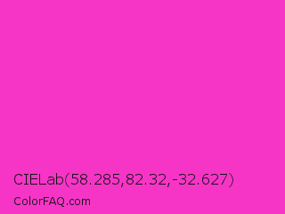 CIELab 58.285,82.32,-32.627 Color is a normal magenta color and the nearest color is Razzle Dazzle Rose #ff33cc. Hex code #f635c7 and RGB value is rgb(246,53,199). In RGB color space, this color is composed of 96% red, 21% green, 78% blue, In CMYK color space, this color is composed of 0% cyan, 78% magenta, 19% yellow , 4% black , In HSL color space, this color has a hue angle of 315° , 91% saturation and 59% lightness.