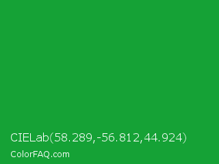 CIELab 58.289,-56.812,44.924 Color is a normal green color and the nearest color is North Texas Green #059033. Hex code #15a236 and RGB value is rgb(21,162,54). In RGB color space, this color is composed of 8% red, 64% green, 21% blue, In CMYK color space, this color is composed of 87% cyan, 0% magenta, 67% yellow , 36% black , In HSL color space, this color has a hue angle of 134° , 77% saturation and 36% lightness.
