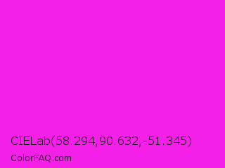 CIELab 58.294,90.632,-51.345 Color is a normal magenta color and the nearest color is Hot Magenta #ff1dce. Hex code #f520e8 and RGB value is rgb(245,32,232). In RGB color space, this color is composed of 96% red, 13% green, 91% blue, In CMYK color space, this color is composed of 0% cyan, 87% magenta, 5% yellow , 4% black , In HSL color space, this color has a hue angle of 304° , 91% saturation and 54% lightness.