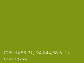 CIELab 58.31,-24.844,58.611 Color is a normal lime color and the nearest color is Trendy Green #7c881a. Hex code #7e9611 and RGB value is rgb(126,150,17). In RGB color space, this color is composed of 49% red, 59% green, 7% blue, In CMYK color space, this color is composed of 16% cyan, 0% magenta, 89% yellow , 41% black , In HSL color space, this color has a hue angle of 71° , 80% saturation and 33% lightness.