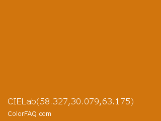 CIELab 58.327,30.079,63.175 Color is a normal orange color and the nearest color is Meteor #d07d12. Hex code #d1750d and RGB value is rgb(209,117,13). In RGB color space, this color is composed of 82% red, 46% green, 5% blue, In CMYK color space, this color is composed of 0% cyan, 44% magenta, 94% yellow , 18% black , In HSL color space, this color has a hue angle of 32° , 88% saturation and 44% lightness.