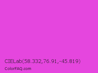 CIELab 58.332,76.91,-45.819 Color is a normal magenta color and the nearest color is Purple Pizzazz #fe4eda. Hex code #e546de and RGB value is rgb(229,70,222). In RGB color space, this color is composed of 90% red, 27% green, 87% blue, In CMYK color space, this color is composed of 0% cyan, 69% magenta, 3% yellow , 10% black , In HSL color space, this color has a hue angle of 303° , 75% saturation and 59% lightness.