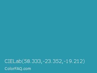 CIELab 58.333,-23.352,-19.212 Color is a normal cyan color and the nearest color is Eastern Blue #1e9ab0. Hex code #2b99ad and RGB value is rgb(43,153,173). In RGB color space, this color is composed of 17% red, 60% green, 68% blue, In CMYK color space, this color is composed of 75% cyan, 12% magenta, 0% yellow , 32% black , In HSL color space, this color has a hue angle of 189° , 60% saturation and 42% lightness.