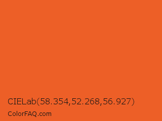 CIELab 58.354,52.268,56.927 Color is a normal orange color and the nearest color is Vivid Vermilion #e56024. Hex code #ed5f27 and RGB value is rgb(237,95,39). In RGB color space, this color is composed of 93% red, 37% green, 15% blue, In CMYK color space, this color is composed of 0% cyan, 60% magenta, 84% yellow , 7% black , In HSL color space, this color has a hue angle of 17° , 85% saturation and 54% lightness.
