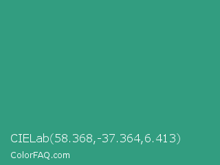 CIELab 58.368,-37.364,6.413 Color is a normal cyan color and the nearest color is Illuminating Emerald #319177. Hex code #329d80 and RGB value is rgb(50,157,128). In RGB color space, this color is composed of 20% red, 62% green, 50% blue, In CMYK color space, this color is composed of 68% cyan, 0% magenta, 18% yellow , 38% black , In HSL color space, this color has a hue angle of 164° , 52% saturation and 41% lightness.