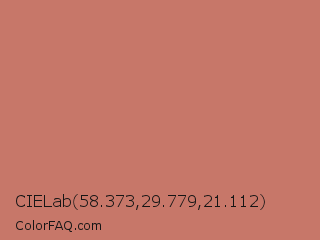 CIELab 58.373,29.779,21.112 Color is a normal red color and the nearest color is Contessa #c6726b. Hex code #c77769 and RGB value is rgb(199,119,105). In RGB color space, this color is composed of 78% red, 47% green, 41% blue, In CMYK color space, this color is composed of 0% cyan, 40% magenta, 47% yellow , 22% black , In HSL color space, this color has a hue angle of 9° , 46% saturation and 60% lightness.