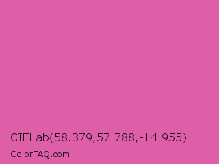 CIELab 58.379,57.788,-14.955 Color is a light magenta color and the nearest color is Thulian Pink #de6fa1. Hex code #de5ea8 and RGB value is rgb(222,94,168). In RGB color space, this color is composed of 87% red, 37% green, 66% blue, In CMYK color space, this color is composed of 0% cyan, 58% magenta, 24% yellow , 13% black , In HSL color space, this color has a hue angle of 325° , 66% saturation and 62% lightness.
