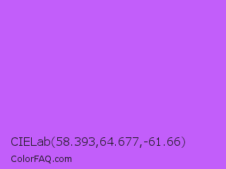 CIELab 58.393,64.677,-61.66 Color is a light purple color and the nearest color is Heliotrope #df73ff. Hex code #c25efa and RGB value is rgb(194,94,250). In RGB color space, this color is composed of 76% red, 37% green, 98% blue, In CMYK color space, this color is composed of 22% cyan, 62% magenta, 0% yellow , 2% black , In HSL color space, this color has a hue angle of 278° , 94% saturation and 67% lightness.