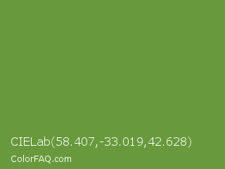 CIELab 58.407,-33.019,42.628 Color is a normal green color and the nearest color is Palm Leaf #6f9940. Hex code #689a3d and RGB value is rgb(104,154,61). In RGB color space, this color is composed of 41% red, 60% green, 24% blue, In CMYK color space, this color is composed of 32% cyan, 0% magenta, 60% yellow , 40% black , In HSL color space, this color has a hue angle of 92° , 43% saturation and 42% lightness.
