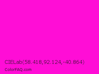 CIELab 58.418,92.124,-40.864 Color is a normal magenta color and the nearest color is Purple Pizzazz #ff00cc. Hex code #ff0dd6 and RGB value is rgb(255,13,214). In RGB color space, this color is composed of 100% red, 5% green, 84% blue, In CMYK color space, this color is composed of 0% cyan, 95% magenta, 16% yellow , 0% black , In HSL color space, this color has a hue angle of 310° , 100% saturation and 53% lightness.