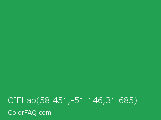 CIELab 58.451,-51.146,31.685 Color is a normal green color and the nearest color is Eucalyptus #278a5b. Hex code #22a152 and RGB value is rgb(34,161,82). In RGB color space, this color is composed of 13% red, 63% green, 32% blue, In CMYK color space, this color is composed of 79% cyan, 0% magenta, 49% yellow , 37% black , In HSL color space, this color has a hue angle of 143° , 65% saturation and 38% lightness.