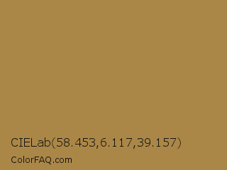 CIELab 58.453,6.117,39.157 Color is a normal orange color and the nearest color is Driftwood #af8751. Hex code #ab8747 and RGB value is rgb(171,135,71). In RGB color space, this color is composed of 67% red, 53% green, 28% blue, In CMYK color space, this color is composed of 0% cyan, 21% magenta, 58% yellow , 33% black , In HSL color space, this color has a hue angle of 38° , 41% saturation and 47% lightness.