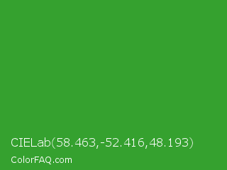 CIELab 58.463,-52.416,48.193 Color is a normal green color and the nearest color is Wageningen Green #34b233. Hex code #35a12f and RGB value is rgb(53,161,47). In RGB color space, this color is composed of 21% red, 63% green, 18% blue, In CMYK color space, this color is composed of 67% cyan, 0% magenta, 71% yellow , 37% black , In HSL color space, this color has a hue angle of 117° , 55% saturation and 41% lightness.