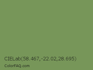 CIELab 58.467,-22.02,28.695 Color is a normal green color and the nearest color is Asparagus Green #7ba05b. Hex code #779659 and RGB value is rgb(119,150,89). In RGB color space, this color is composed of 47% red, 59% green, 35% blue, In CMYK color space, this color is composed of 21% cyan, 0% magenta, 41% yellow , 41% black , In HSL color space, this color has a hue angle of 90° , 26% saturation and 47% lightness.