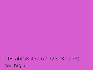 CIELab 58.467,62.326,-37.273 Color is a normal magenta color and the nearest color is Orchid #da70d6. Hex code #d65ccf and RGB value is rgb(214,92,207). In RGB color space, this color is composed of 84% red, 36% green, 81% blue, In CMYK color space, this color is composed of 0% cyan, 57% magenta, 3% yellow , 16% black , In HSL color space, this color has a hue angle of 303° , 60% saturation and 60% lightness.