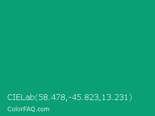 CIELab 58.478,-45.823,13.231 Color is a normal green color and the nearest color is Green Munsell #00a877. Hex code #0aa074 and RGB value is rgb(10,160,116). In RGB color space, this color is composed of 4% red, 63% green, 45% blue, In CMYK color space, this color is composed of 94% cyan, 0% magenta, 28% yellow , 37% black , In HSL color space, this color has a hue angle of 162° , 88% saturation and 33% lightness.