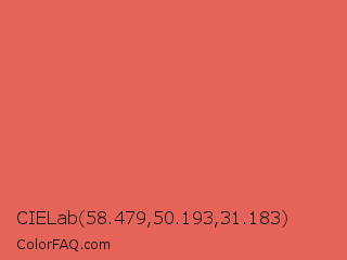 CIELab 58.479,50.193,31.183 Color is a light red color and the nearest color is Roman #de6360. Hex code #e66359 and RGB value is rgb(230,99,89). In RGB color space, this color is composed of 90% red, 39% green, 35% blue, In CMYK color space, this color is composed of 0% cyan, 57% magenta, 61% yellow , 10% black , In HSL color space, this color has a hue angle of 4° , 74% saturation and 63% lightness.