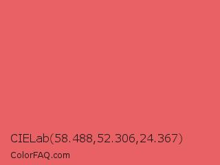CIELab 58.488,52.306,24.367 Color is a light red color and the nearest color is Sunglo #e16865. Hex code #e76165 and RGB value is rgb(231,97,101). In RGB color space, this color is composed of 91% red, 38% green, 40% blue, In CMYK color space, this color is composed of 0% cyan, 58% magenta, 56% yellow , 9% black , In HSL color space, this color has a hue angle of 358° , 74% saturation and 64% lightness.