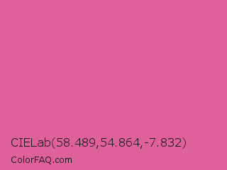 CIELab 58.489,54.864,-7.832 Color is a light rose color and the nearest color is Thulian Pink #de6fa1. Hex code #de619c and RGB value is rgb(222,97,156). In RGB color space, this color is composed of 87% red, 38% green, 61% blue, In CMYK color space, this color is composed of 0% cyan, 56% magenta, 30% yellow , 13% black , In HSL color space, this color has a hue angle of 332° , 65% saturation and 63% lightness.