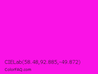 CIELab 58.48,92.885,-49.872 Color is a normal magenta color and the nearest color is Hot Magenta #ff1dce. Hex code #fa12e6 and RGB value is rgb(250,18,230). In RGB color space, this color is composed of 98% red, 7% green, 90% blue, In CMYK color space, this color is composed of 0% cyan, 93% magenta, 8% yellow , 2% black , In HSL color space, this color has a hue angle of 305° , 96% saturation and 53% lightness.