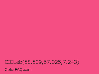 CIELab 58.509,67.025,7.243 Color is a light rose color and the nearest color is French Rose #f64a8a. Hex code #f54e83 and RGB value is rgb(245,78,131). In RGB color space, this color is composed of 96% red, 31% green, 51% blue, In CMYK color space, this color is composed of 0% cyan, 68% magenta, 47% yellow , 4% black , In HSL color space, this color has a hue angle of 341° , 89% saturation and 63% lightness.
