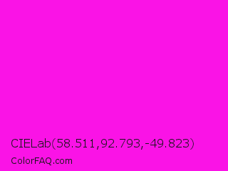CIELab 58.511,92.793,-49.823 Color is a normal magenta color and the nearest color is Hot Magenta #ff1dce. Hex code #fa13e6 and RGB value is rgb(250,19,230). In RGB color space, this color is composed of 98% red, 7% green, 90% blue, In CMYK color space, this color is composed of 0% cyan, 92% magenta, 8% yellow , 2% black , In HSL color space, this color has a hue angle of 305° , 96% saturation and 53% lightness.