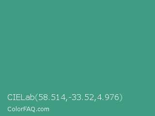 CIELab 58.514,-33.52,4.976 Color is a normal cyan color and the nearest color is Zomp #39a78e. Hex code #409c83 and RGB value is rgb(64,156,131). In RGB color space, this color is composed of 25% red, 61% green, 51% blue, In CMYK color space, this color is composed of 59% cyan, 0% magenta, 16% yellow , 39% black , In HSL color space, this color has a hue angle of 164° , 42% saturation and 43% lightness.