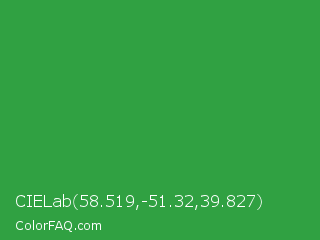 CIELab 58.519,-51.32,39.827 Color is a normal green color and the nearest color is Wageningen Green #34b233. Hex code #30a142 and RGB value is rgb(48,161,66). In RGB color space, this color is composed of 19% red, 63% green, 26% blue, In CMYK color space, this color is composed of 70% cyan, 0% magenta, 59% yellow , 37% black , In HSL color space, this color has a hue angle of 130° , 54% saturation and 41% lightness.