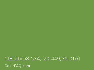CIELab 58.534,-29.449,39.016 Color is a normal green color and the nearest color is Palm Leaf #6f9940. Hex code #6e9945 and RGB value is rgb(110,153,69). In RGB color space, this color is composed of 43% red, 60% green, 27% blue, In CMYK color space, this color is composed of 28% cyan, 0% magenta, 55% yellow , 40% black , In HSL color space, this color has a hue angle of 91° , 38% saturation and 44% lightness.
