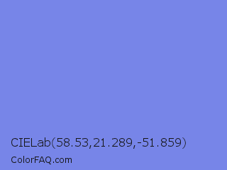 CIELab 58.53,21.289,-51.859 Color is a light blue color and the nearest color is Chetwode Blue #8581d9. Hex code #7785e8 and RGB value is rgb(119,133,232). In RGB color space, this color is composed of 47% red, 52% green, 91% blue, In CMYK color space, this color is composed of 49% cyan, 43% magenta, 0% yellow , 9% black , In HSL color space, this color has a hue angle of 233° , 71% saturation and 69% lightness.
