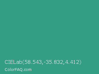 CIELab 58.543,-35.832,4.412 Color is a normal cyan color and the nearest color is Zomp #39a78e. Hex code #359d84 and RGB value is rgb(53,157,132). In RGB color space, this color is composed of 21% red, 62% green, 52% blue, In CMYK color space, this color is composed of 66% cyan, 0% magenta, 16% yellow , 38% black , In HSL color space, this color has a hue angle of 166° , 50% saturation and 41% lightness.