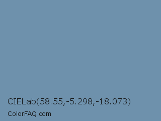 CIELab 58.55,-5.298,-18.073 Color is a normal blue color and the nearest color is Gothic #6d92a1. Hex code #6e91ac and RGB value is rgb(110,145,172). In RGB color space, this color is composed of 43% red, 57% green, 67% blue, In CMYK color space, this color is composed of 36% cyan, 16% magenta, 0% yellow , 33% black , In HSL color space, this color has a hue angle of 206° , 27% saturation and 55% lightness.