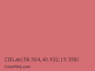 CIELab 58.564,40.932,15.358 Color is a light red color and the nearest color is Candy Pink #e4717a. Hex code #d56e74 and RGB value is rgb(213,110,116). In RGB color space, this color is composed of 84% red, 43% green, 45% blue, In CMYK color space, this color is composed of 0% cyan, 48% magenta, 46% yellow , 16% black , In HSL color space, this color has a hue angle of 357° , 55% saturation and 63% lightness.