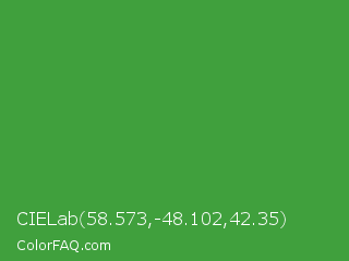 CIELab 58.573,-48.102,42.35 Color is a normal green color and the nearest color is Apple #4fa83d. Hex code #40a03d and RGB value is rgb(64,160,61). In RGB color space, this color is composed of 25% red, 63% green, 24% blue, In CMYK color space, this color is composed of 60% cyan, 0% magenta, 62% yellow , 37% black , In HSL color space, this color has a hue angle of 118° , 45% saturation and 43% lightness.