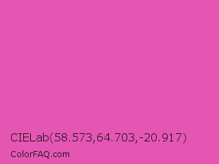 CIELab 58.573,64.703,-20.917 Color is a light magenta color and the nearest color is Brilliant Rose #f653a6. Hex code #e556b3 and RGB value is rgb(229,86,179). In RGB color space, this color is composed of 90% red, 34% green, 70% blue, In CMYK color space, this color is composed of 0% cyan, 62% magenta, 22% yellow , 10% black , In HSL color space, this color has a hue angle of 321° , 73% saturation and 62% lightness.