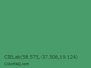 CIELab 58.575,-37.506,19.124 Color is a normal green color and the nearest color is Fruit Salad #4f9d5d. Hex code #499d6a and RGB value is rgb(73,157,106). In RGB color space, this color is composed of 29% red, 62% green, 42% blue, In CMYK color space, this color is composed of 54% cyan, 0% magenta, 32% yellow , 38% black , In HSL color space, this color has a hue angle of 144° , 37% saturation and 45% lightness.