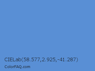 CIELab 58.577,2.925,-41.287 Color is a normal blue color and the nearest color is Havelock Blue #5590d9. Hex code #598fd5 and RGB value is rgb(89,143,213). In RGB color space, this color is composed of 35% red, 56% green, 84% blue, In CMYK color space, this color is composed of 58% cyan, 33% magenta, 0% yellow , 16% black , In HSL color space, this color has a hue angle of 214° , 60% saturation and 59% lightness.