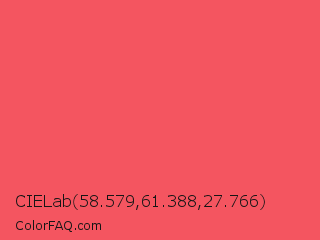 CIELab 58.579,61.388,27.766 Color is a light red color and the nearest color is Carnation #f95a61. Hex code #f45560 and RGB value is rgb(244,85,96). In RGB color space, this color is composed of 96% red, 33% green, 38% blue, In CMYK color space, this color is composed of 0% cyan, 65% magenta, 61% yellow , 4% black , In HSL color space, this color has a hue angle of 356° , 88% saturation and 65% lightness.