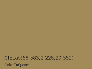 CIELab 58.583,2.228,29.552 Color is a normal orange color and the nearest color is Barley Corn #a68b5b. Hex code #a28a59 and RGB value is rgb(162,138,89). In RGB color space, this color is composed of 64% red, 54% green, 35% blue, In CMYK color space, this color is composed of 0% cyan, 15% magenta, 45% yellow , 36% black , In HSL color space, this color has a hue angle of 40° , 29% saturation and 49% lightness.
