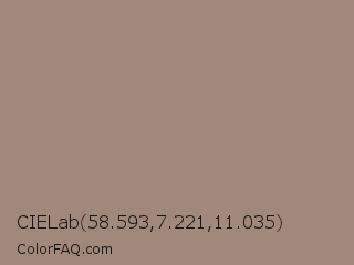 CIELab 58.593,7.221,11.035 Color is a normal orange color and the nearest color is Pharlap #a3807b. Hex code #a1887a and RGB value is rgb(161,136,122). In RGB color space, this color is composed of 63% red, 53% green, 48% blue, In CMYK color space, this color is composed of 0% cyan, 16% magenta, 24% yellow , 37% black , In HSL color space, this color has a hue angle of 22° , 17% saturation and 55% lightness.