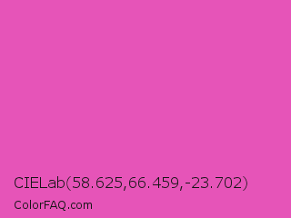 CIELab 58.625,66.459,-23.702 Color is a light magenta color and the nearest color is Brilliant Rose #f653a6. Hex code #e654b8 and RGB value is rgb(230,84,184). In RGB color space, this color is composed of 90% red, 33% green, 72% blue, In CMYK color space, this color is composed of 0% cyan, 63% magenta, 20% yellow , 10% black , In HSL color space, this color has a hue angle of 319° , 74% saturation and 62% lightness.