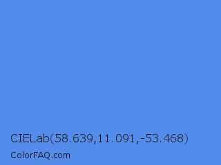 CIELab 58.639,11.091,-53.468 Color is a light blue color and the nearest color is United Nations Blue #5b92e5. Hex code #548ceb and RGB value is rgb(84,140,235). In RGB color space, this color is composed of 33% red, 55% green, 92% blue, In CMYK color space, this color is composed of 64% cyan, 40% magenta, 0% yellow , 8% black , In HSL color space, this color has a hue angle of 218° , 79% saturation and 63% lightness.