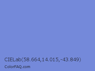CIELab 58.664,14.015,-43.849 Color is a light blue color and the nearest color is Chetwode Blue #8581d9. Hex code #7489da and RGB value is rgb(116,137,218). In RGB color space, this color is composed of 45% red, 54% green, 85% blue, In CMYK color space, this color is composed of 47% cyan, 37% magenta, 0% yellow , 15% black , In HSL color space, this color has a hue angle of 228° , 58% saturation and 65% lightness.